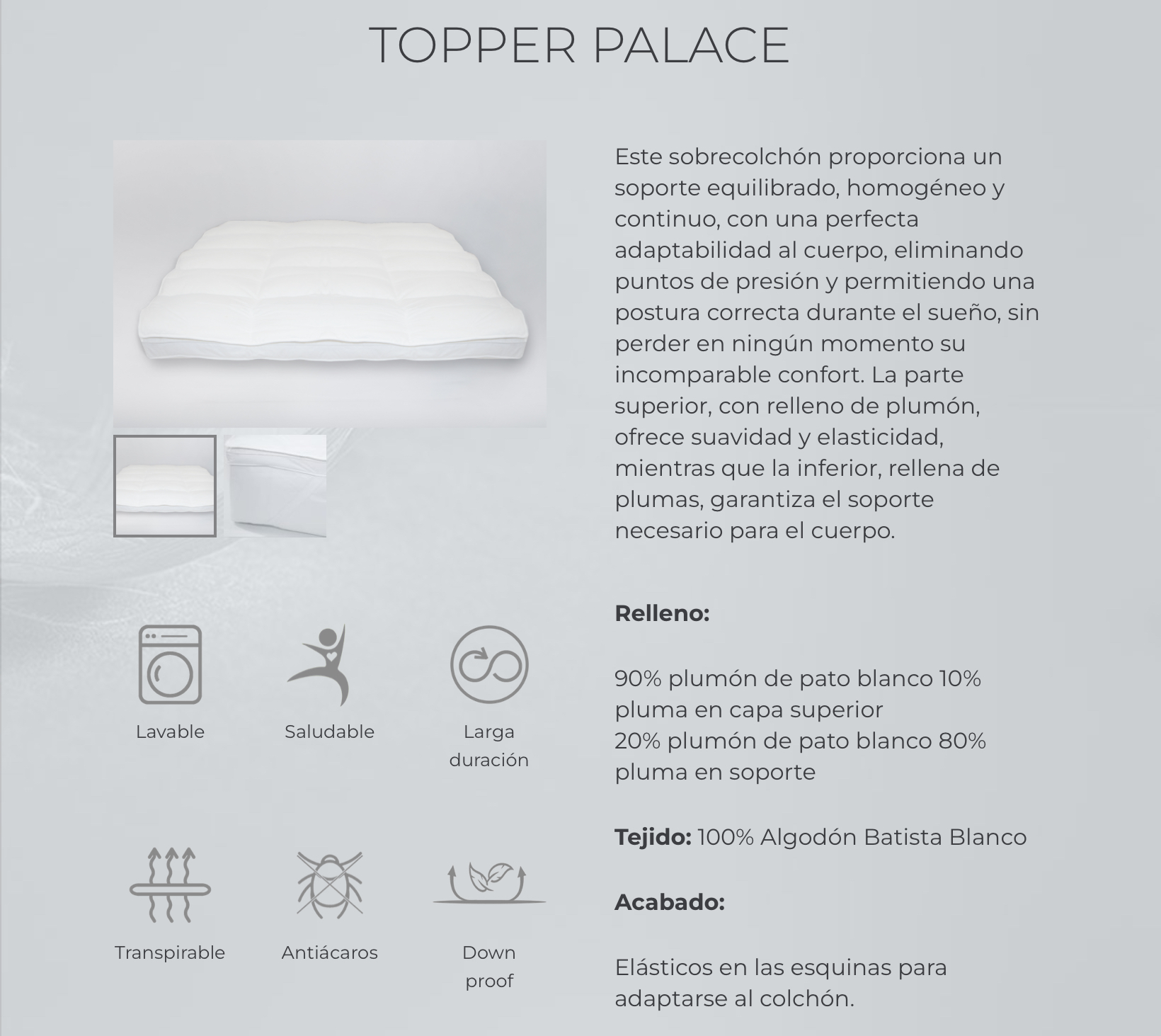 Ideal para Todos: Si buscas un descanso exclusivo, el Topper Palace es la elección perfecta. Su diseño revolucionario se adapta a cualquier tipo de colchón, mejorando tu calidad de sueño y asegurando que te despiertes renovado cada mañana.